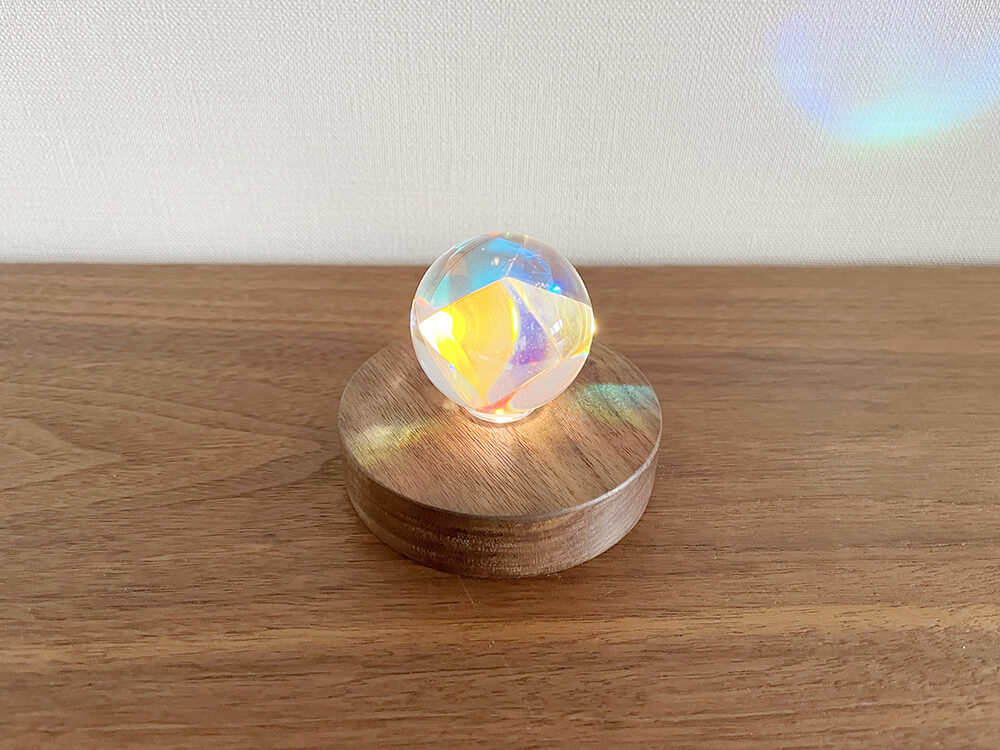 光りをあてることで、虹色に輝くプリズムボール。角度によって色の変化が楽しめる。